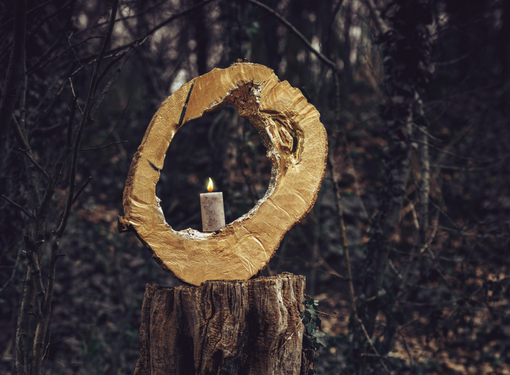 Inmitten eines düsteren, fast vergessenen Waldes erhebt sich ein altes Baumfragment – ausgehöhlt, verwittert und dennoch kraftvoll. In seinem Herzen ruht eine brennende Kerze, geschützt durch einen golden bemalten Holzring – wie ein zerbrechlicher Blick in eine andere Welt. Die Flamme steht still und ruhig, ein Symbol für Hoffnung, Erinnerung und das Bewahren von Licht im Dunkel.